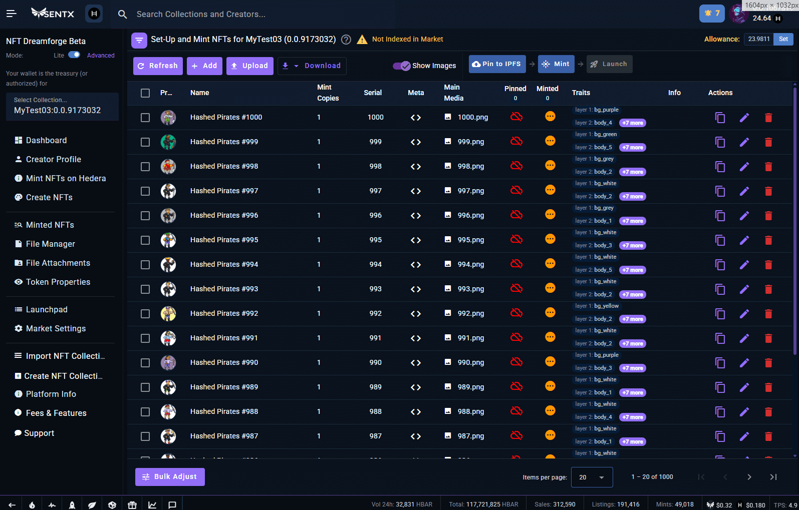 Most importantly, Dreamforge directly integrates with SentX, the leading NFT marketplace on Hedera with over 95% market share and hundreds of daily active users. Your collections are automatically indexed and available for trading immediately after creation, giving you instant access to the largest NFT community on Hedera.